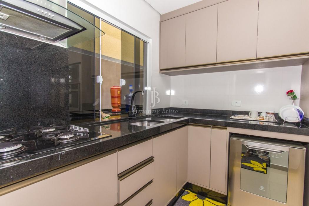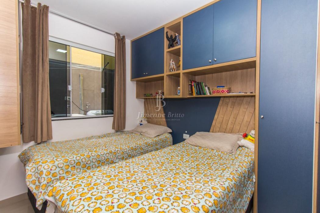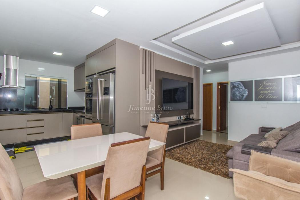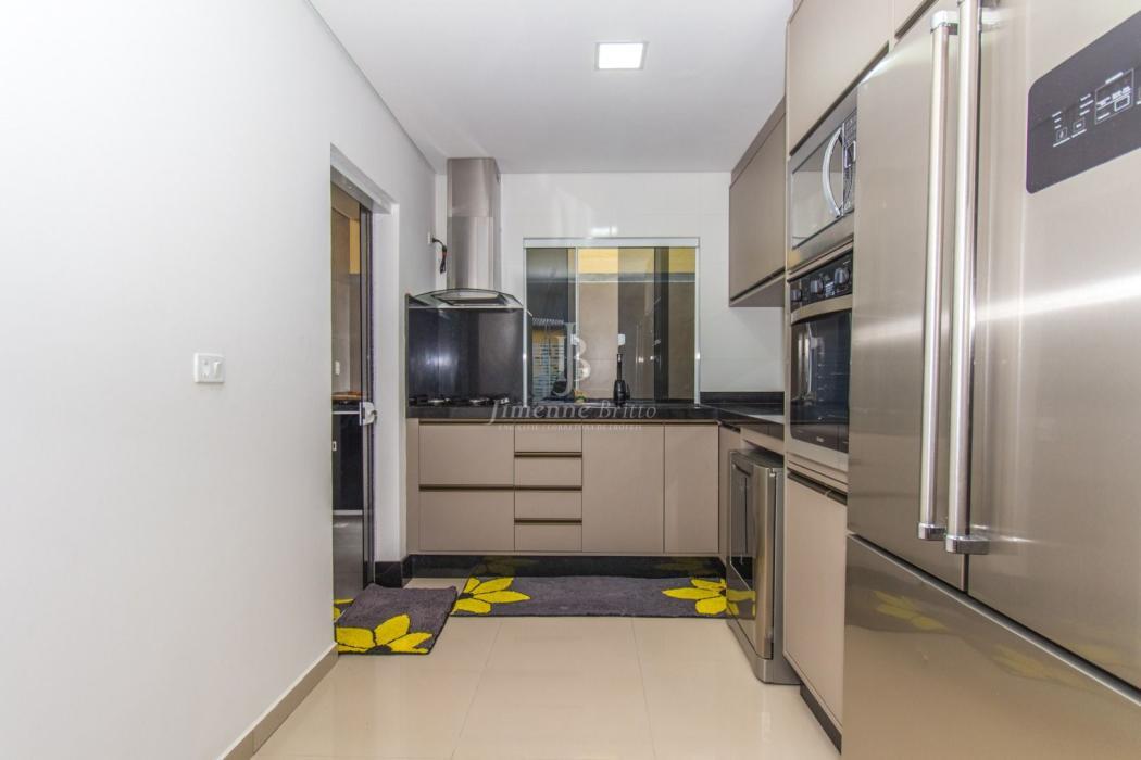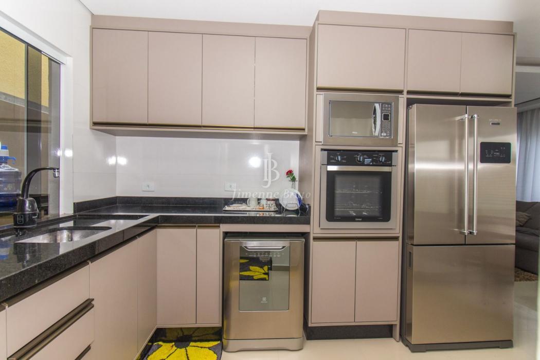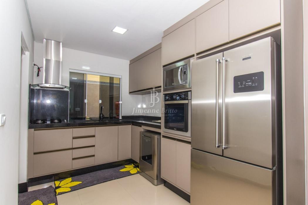 A casa dispõe de cozinha com armários planejados, banheiros com armário, espelho e box em vidro, piso porcelanato em todo o imóvel, dois dormitórios principais com móveis planejados.