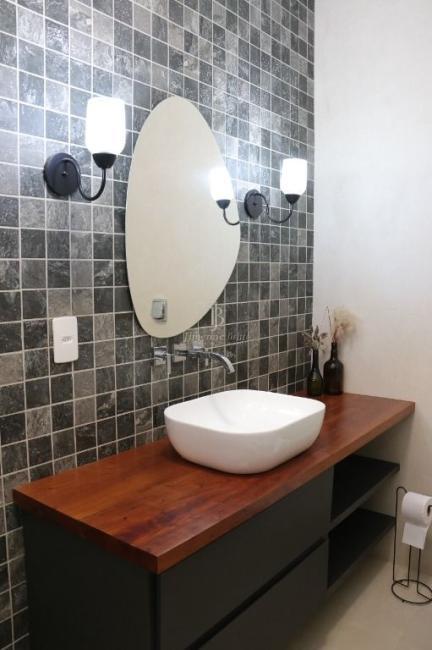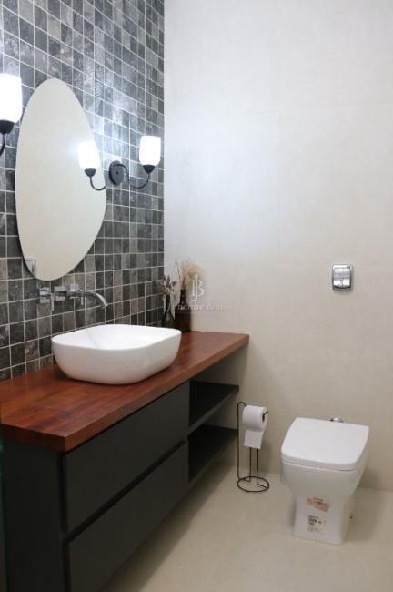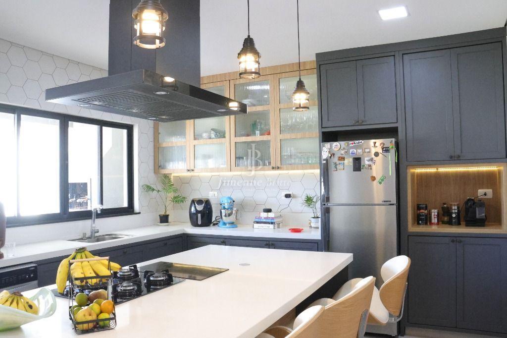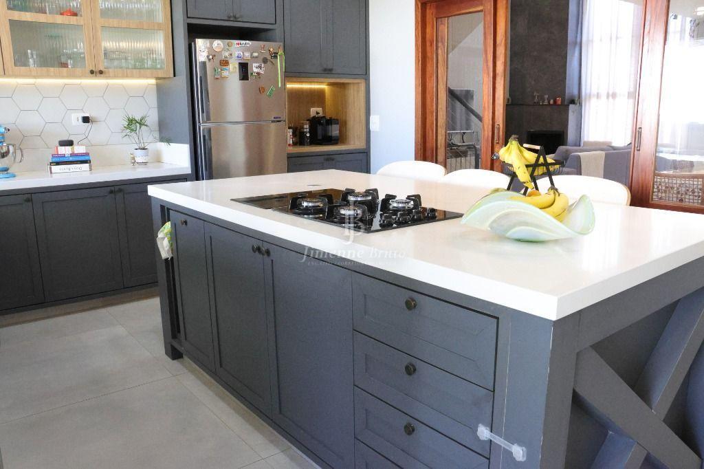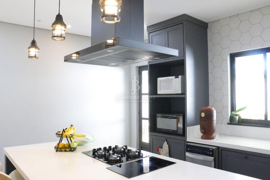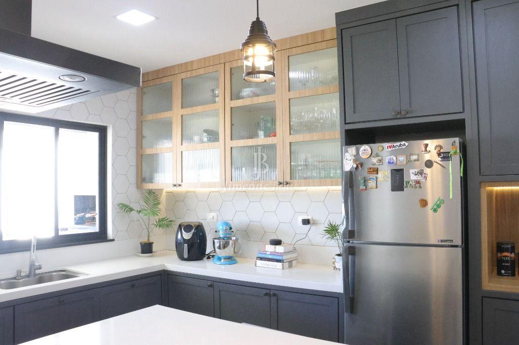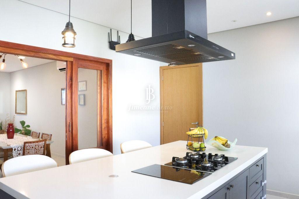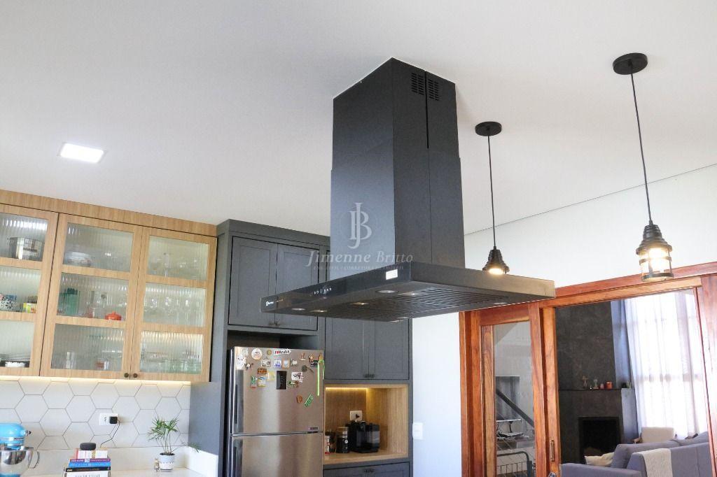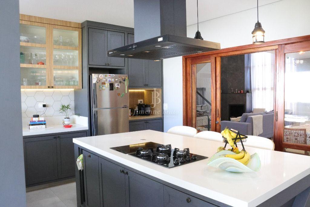 Ainda na parte inferior da casa: Uma cozinha com ilha, com fogão cooktop e indução de 2 bocas dando maior agilidade para as refeições, bancadas da cozinha em dekton branco, marcenaria de qualidade e muito bom gosto, bem iluminada e arejada, dando acesso a área de churrasco e piscina.