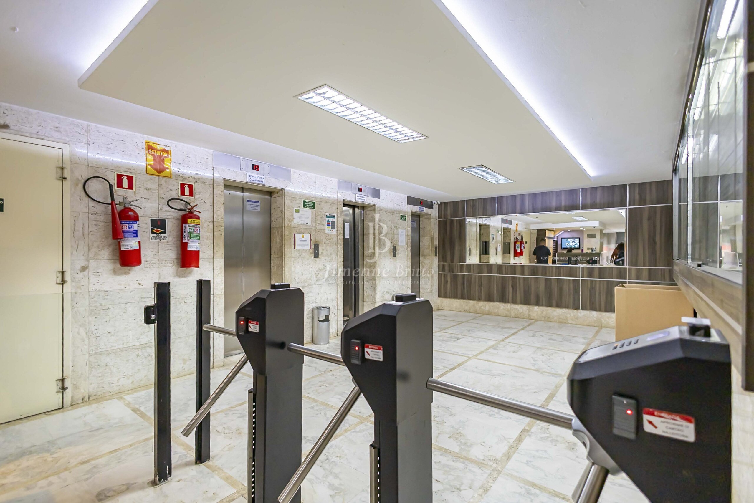 Condomínio com portaria presencial, catraca eletrônica e 3 elevadores.