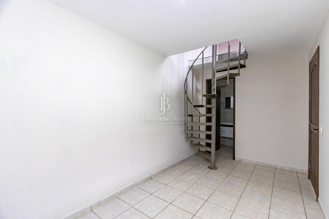 Piso superior com acesso por escada caracol, ideal para escritório, ateliê ou depósito